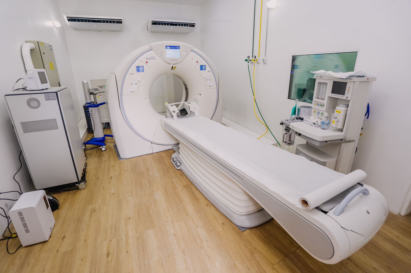 Exames rápidos e precisos – O tomógrafo, um aparelho da Canon Medical Systems, proporciona máxima produtividade e alta definição com exames extremamente rápidos e precisos, além de permitir as mais avançadas técnicas tomográficas. A máquina também oferece ao paciente conforto e facilidade de posicionamento e assegura flexibilidade e precisão em qualquer tipo de exame, reduzindo a repetição de exames e diminuindo a ansiedade dos pacientes.